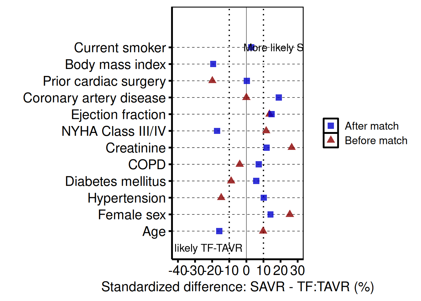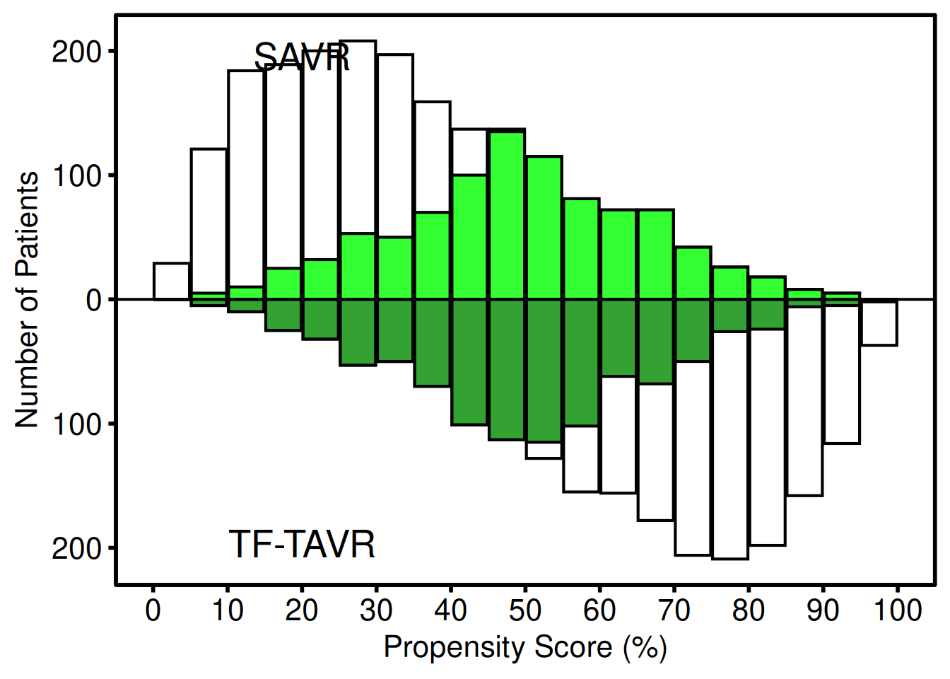 match_col): upper bars show all observations before matching; overlaid bars show the matched subset. This reproducestp.lp.mirror-histogram_SAVR-TF-TAVR.R. -