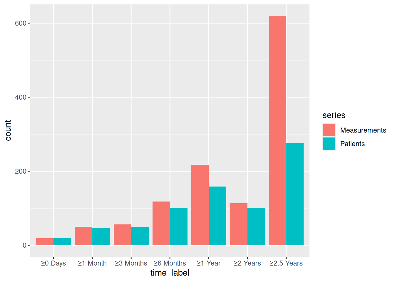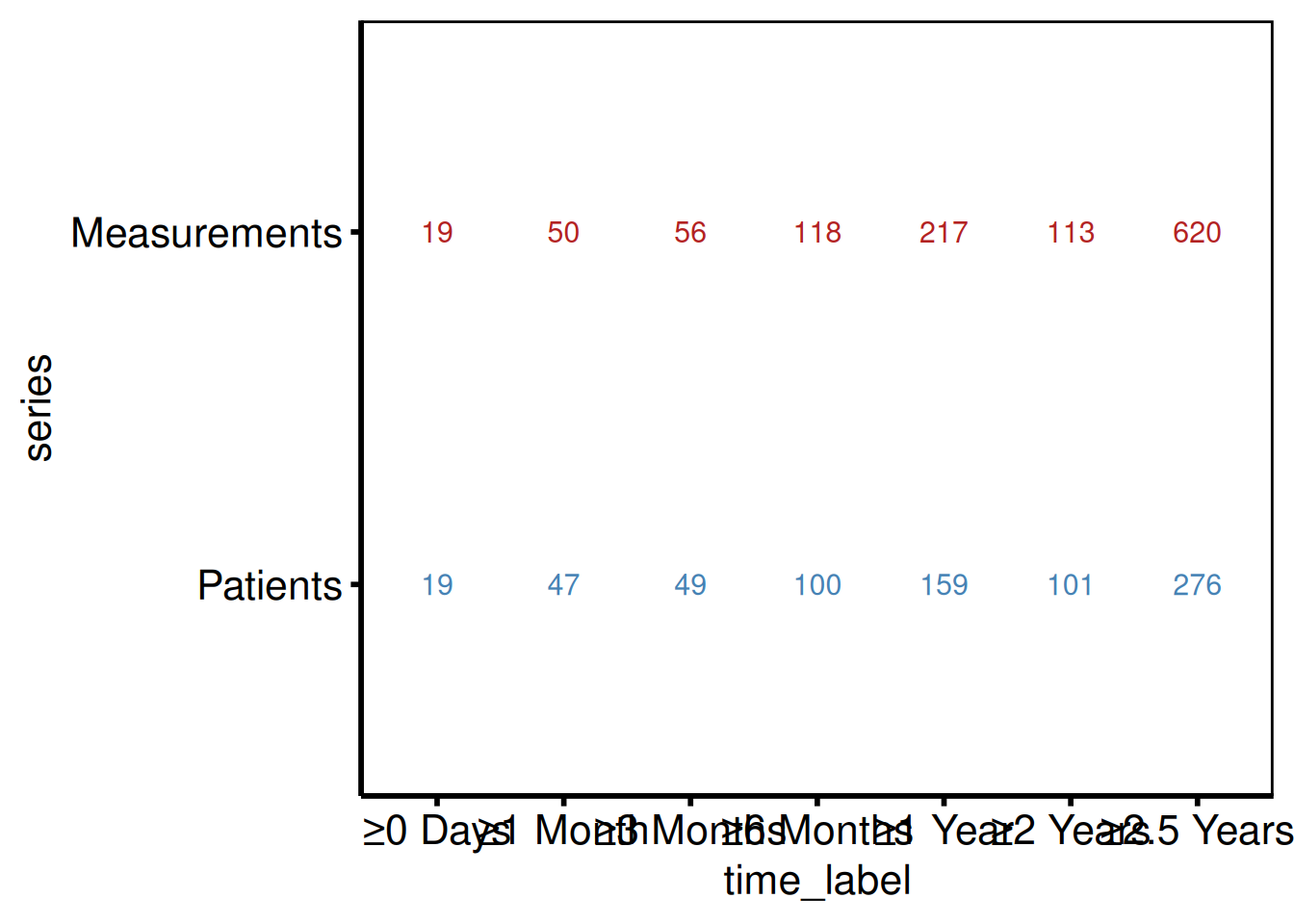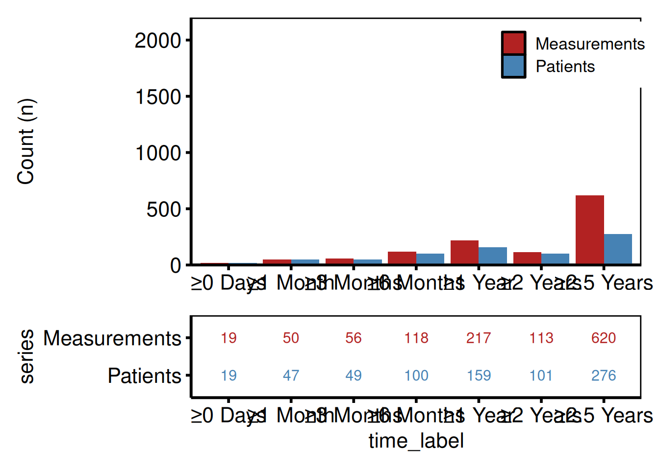 hv_longitudinal() reproduces the two-panel layout from tp.dp.longitudinal_patients_measures.*: a grouped bar chart of patients and measurements at each follow-up window, paired with a numeric summary table below. Call plot(lc) for the bar chart and plot(lc, type = "table") for the table panel. Compose the two panels with patchwork.