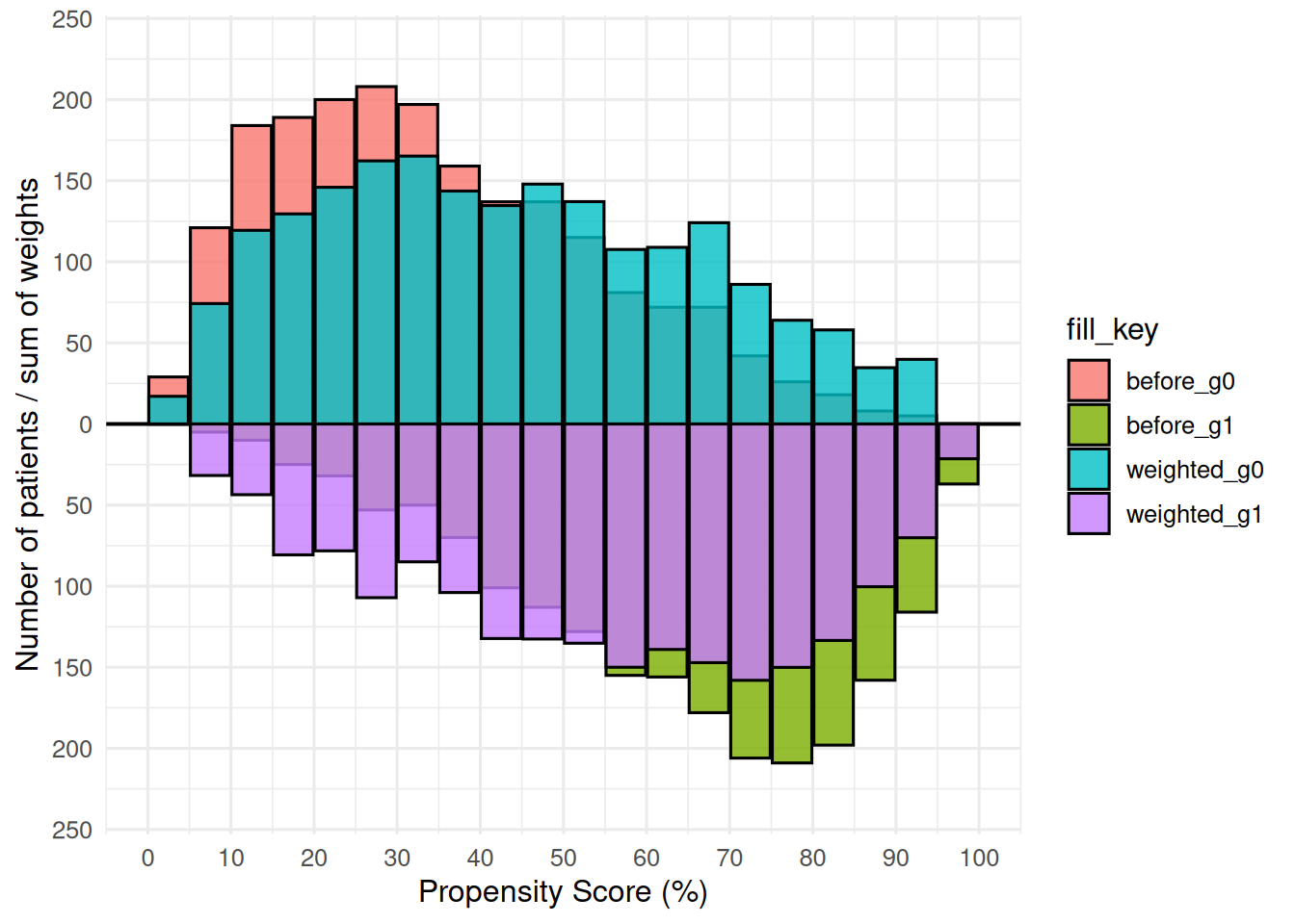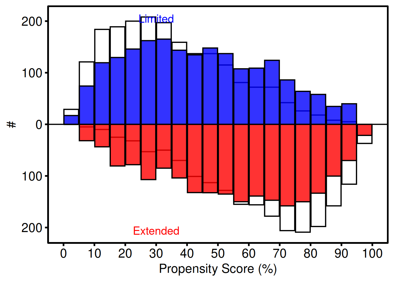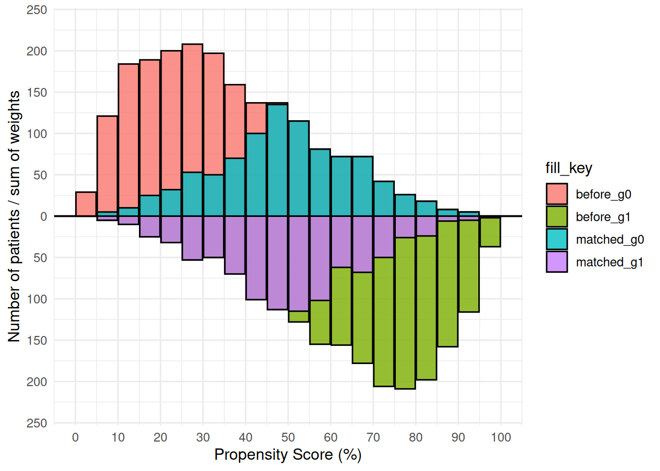 ggplot2::labs(x = "Propensity Score (%)", y = "Number of Patients") +
