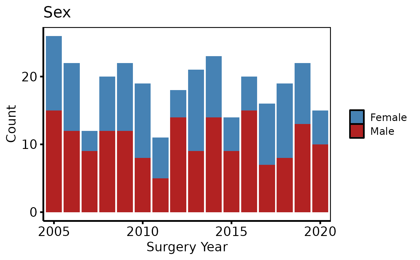 ggplot2::labs(x = "Surgery Year", y = "Count") +