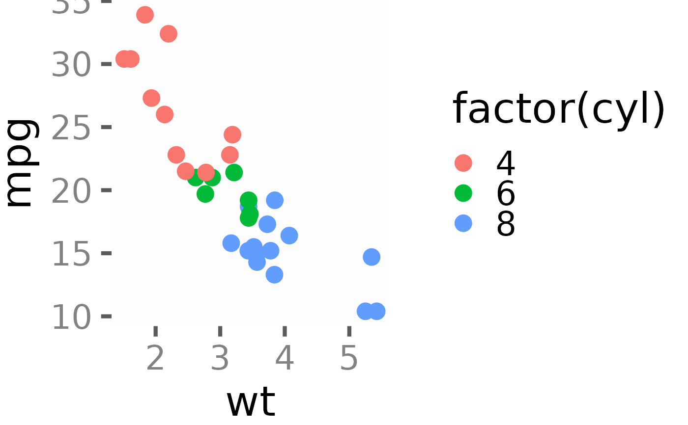 p <- ggplot(mtcars, aes(wt, mpg, colour = factor(cyl))) + geom_point()