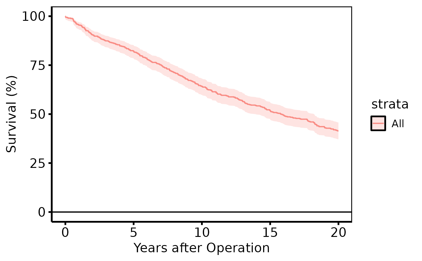 ggplot2::labs(x = "Years after Operation", y = "Survival (%)") +