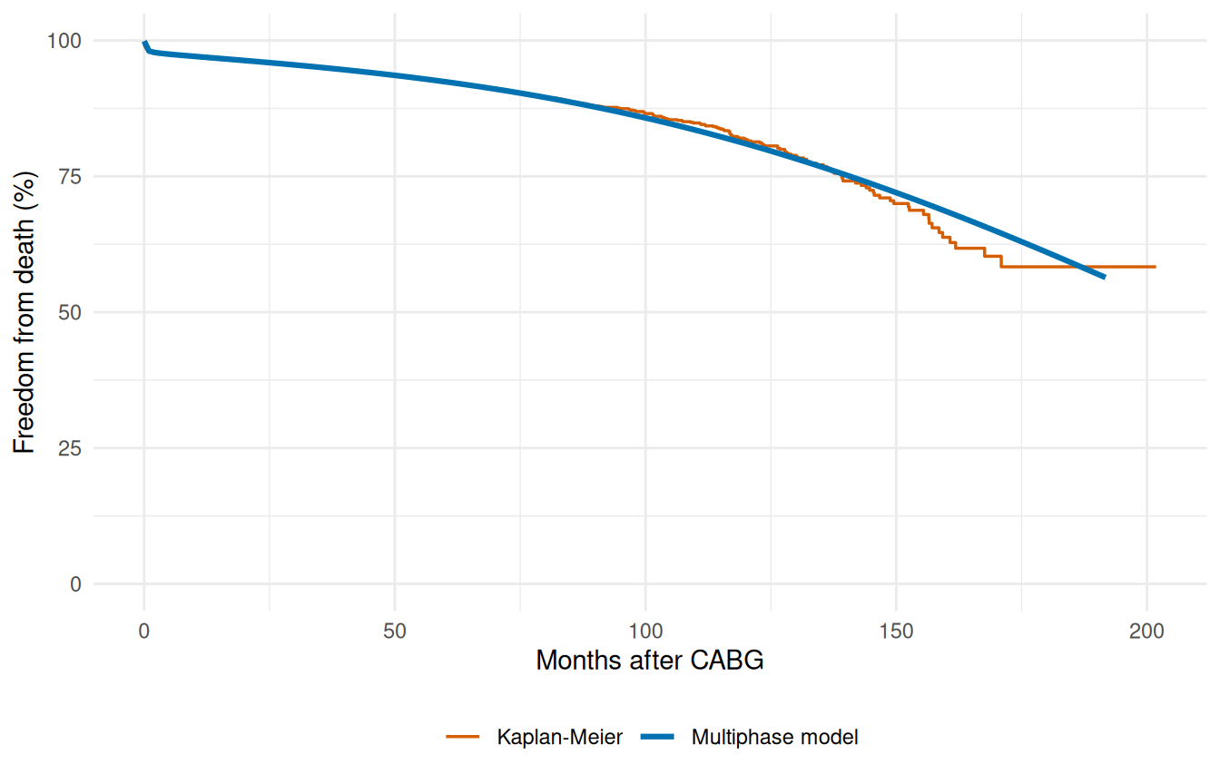 values = c("Multiphase model" = "#0072B2", "Kaplan-Meier" = "#D55E00")