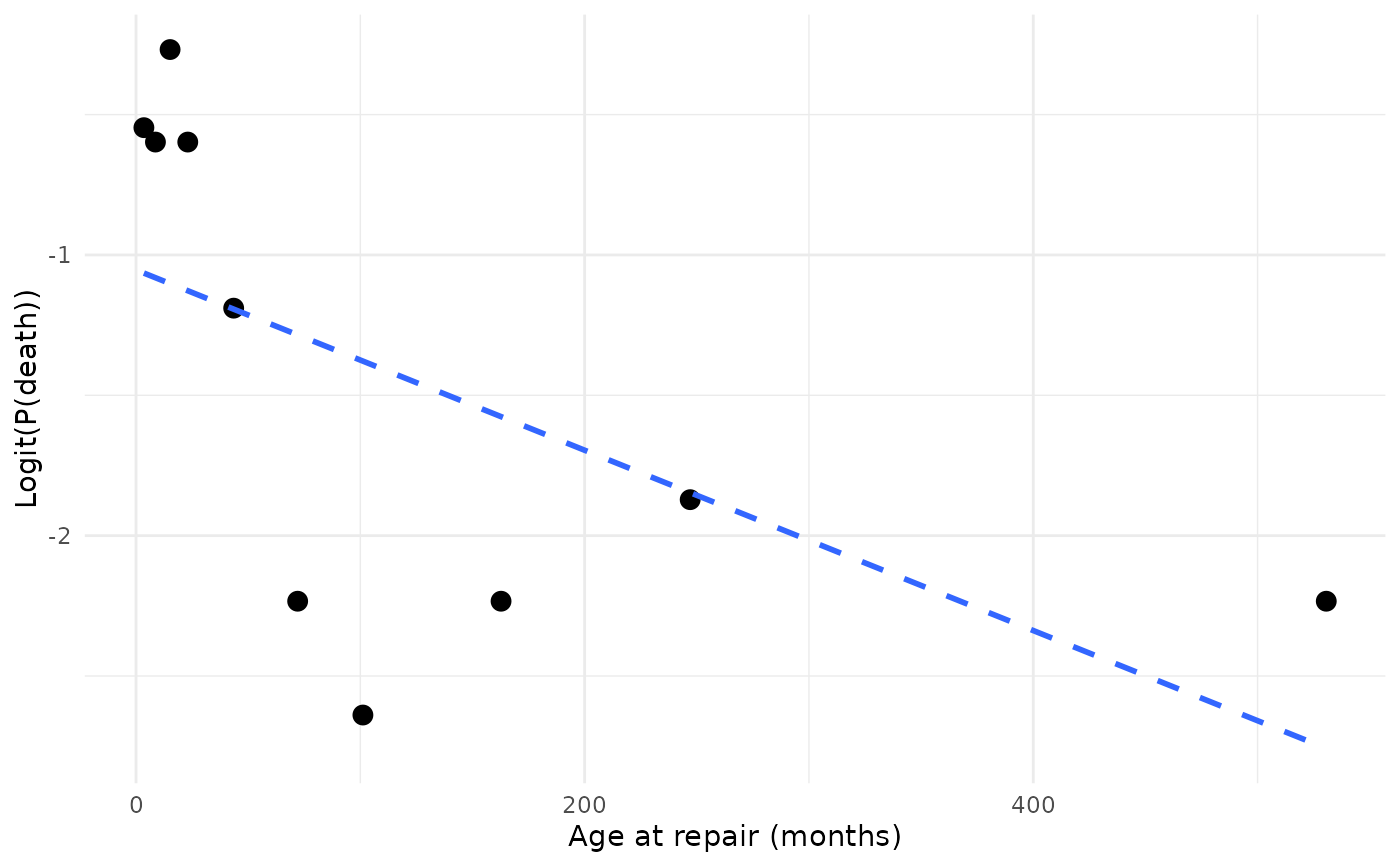 labs(x = "Age at repair (months)", y = "Logit(P(death))") +