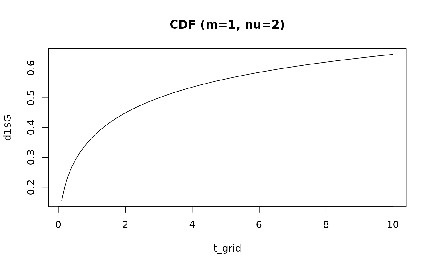 plot(t_grid, d1$G, type = "l", main = "CDF (m=1, nu=2)")